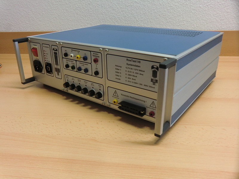 Der Aufbau ist durch die gute Dokumentation von Hr. Weigl problemlos, nimmt aber dennoch einiges an Zeit in Anspruch. Zudem hatte ich Sonderwünsche bezüglich des Gehäuses. Der übliche Aufbau des Roetest mit Prüfling oben auf dem RoeTest und Laptop daneben kam für mich nicht in Frage. In meiner kleinen Bude ist eine geringe Stellfläche sehr wichtig, der Laptop sollte daher oben auf das Roetest passen. Aufgebaut aus den Fragmenten zweier alter Schroff 19"-Gehäuse sieht mein RoeTest so aus: