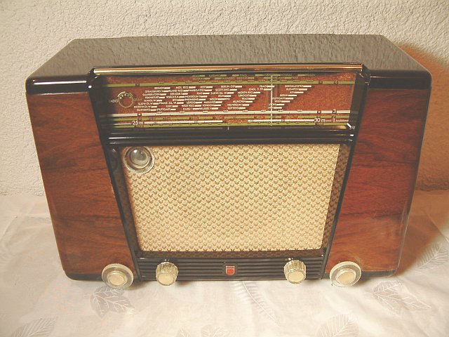 Diese Geräte kamen 1950 auf den Markt und die Ausführung, wie ich sie besitze, kostete damals 299,00 DM. Nach den Aufdrucken auf einigen Kondensatoren dürfte mein Gerät im Oktober 1950 gebaut worden sein. Die Röhrenbestückung ist bereits mit Röhren der 40-er Serie ausgeführt: ECH42, EAF42, EM34, EBC41, EL41 und AZ41. Der UKW-Pendler ist ein Philips "UKW-Einbauteil 7768" und mit der EF41 und EF42 bestückt. Das Gehäuse ist aus Bakelit und mit einem Holzimitat versehen. Die Skala ist als Wechselskala ausgeführt und läßt sich nach oben herausziehen. Die nächsten Fotos zeigen das unrestaurierte Gerät.