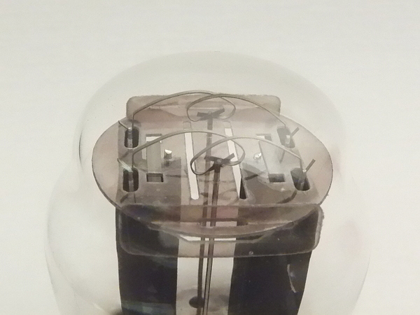 Die Heizfäden sind bei dieser Röhre über um 180 Grad gebogene Federn aufgehängt. An Haltestegen, die oben aus der zentralen Glimmerplatte herausragen. An dieser Glimmerplatte sitzen seitlich zwei zusätzliche Glimmerhalterungen, mit denen das System im Glaskolben fixiert wird.