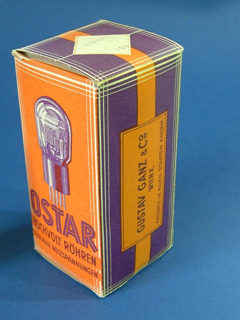 Von der Firma Ostar Gustav Ganz & Co Wien stammt diese indirekt geheizte Einweg-Netzgleichrichterröhre. Die Firma Ostar fertigte spezielle Röhren, die mit ihren Heizungen direkt am Netz betrieben werden konnten. Es gab Typen für 110V oder 220V Heizspannung.