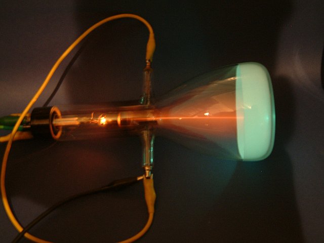 Die Röhre ist mit einer Restfüllung Neon versehen, die durch die Elektronen angeregt wird. Daher kann man sehr schön die Elektronenbahnen innerhalb der Röhre verfolgen. Die nächsten Fotos zeigen die Röhre im Betrieb.